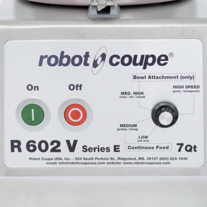 The Robot Coupe R602VB requires a 120V, 1 Phase electrical connection for operation. For additional protection, a magnetic safety system is built into the unit.