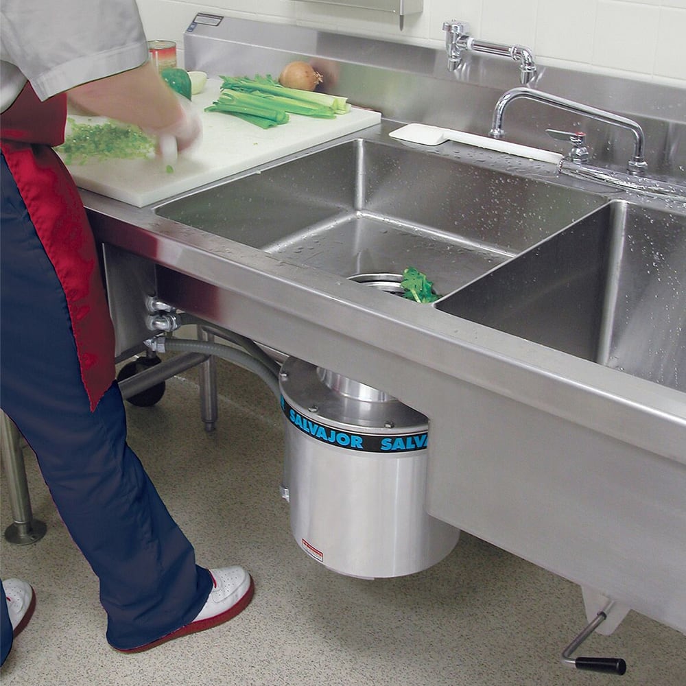 Water Saving Package with Operator Sensor, Disposer, Sink Assembly, 6-1/2″ sink collar, 1 Hp motor, start/stop push button, drain/flush/time delay, automatic reversing & water saving with safety line disconnect ARSS-LD control, includes fixed nozzle, chrome plated vacuum breaker, solenoid valve, sink stopper & flow control, heat treated aluminum alloy housing, UL, CSA, CE