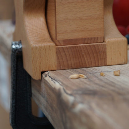 The gear cover is attached to the basic frame with 4 wooden pegs. The wooden pegs are not commercial merchandise; they are specially made for this flaker. The conical flank on the peg ensures that the cover is always centered. The peg stop ensures an even installation depth and thus a tight closure. - Scraper blades