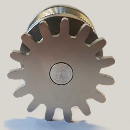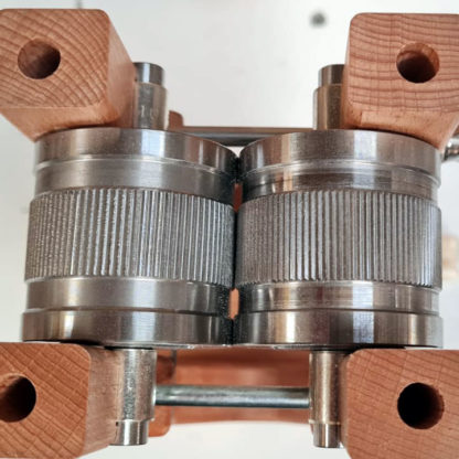 The two rollers made of nickel-free stainless steel move in opposite directions, with the left roller driven by the hand crank. The inner thread of the crank runs outward, the power transmission occurs from the front side of the crank thread to the front side of the roller. Thus, inner and outer threads remain free of force locks. Both rollers have 2 smooth round surfaces, which have a larger diameter than the knurls. This can prevent damage to the knurls during forceful fine adjustment. The opposing knurls cause the crushing process. - Gears