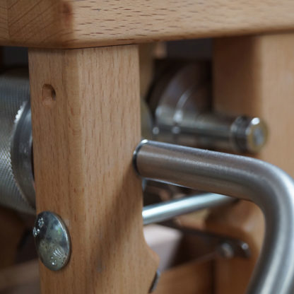 On the two hinge screws (which lead through the base frame of the flaker), wing nuts are attached. These are used to adjust the distance between the rollers and can determine the thickness of the flakes.