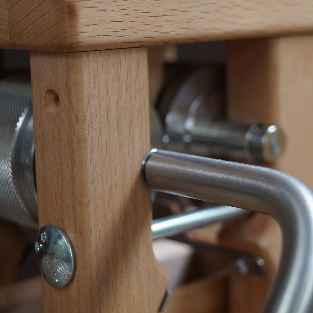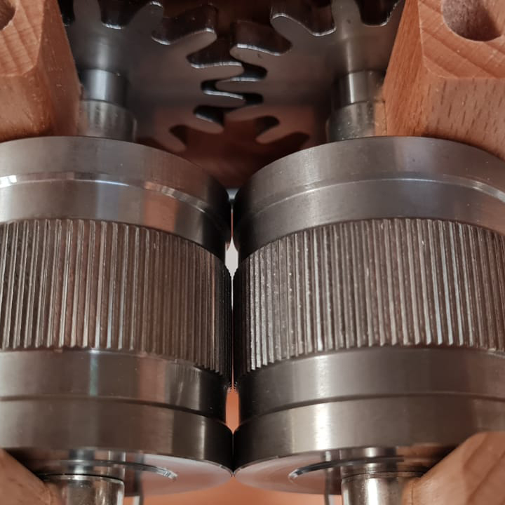 The two rollers made of nickel-free stainless steel move in opposite directions, with the left roller driven by the hand crank. The inner thread of the crank runs outward, the power transmission occurs from the front side of the crank thread to the front side of the roller. Thus, inner and outer threads remain free of force locks. Both rollers have 2 smooth round surfaces, which have a larger diameter than the knurls. This can prevent damage to the knurls during forceful fine adjustment. The opposing knurls cause the crushing process. - Gears