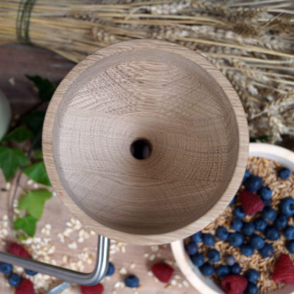The round, finely crafted shape of the hopper is completely edge-free on the inside. This seamless manufacturing prevents residues of seeds and grains. Hence, contamination is excluded. The hopper base plate forms the transition from the rectangular shape of the uprights to the round shape of the hopper. The hopper unit is attached to the uprights using 4 wooden dowels. For cleaning work on the rollers, the hopper unit can be removed without tools. Furthermore, the hopper base plate covers the front side of the gear cover (child protection). Hopper removal – see operating instructions. - Feed wedge