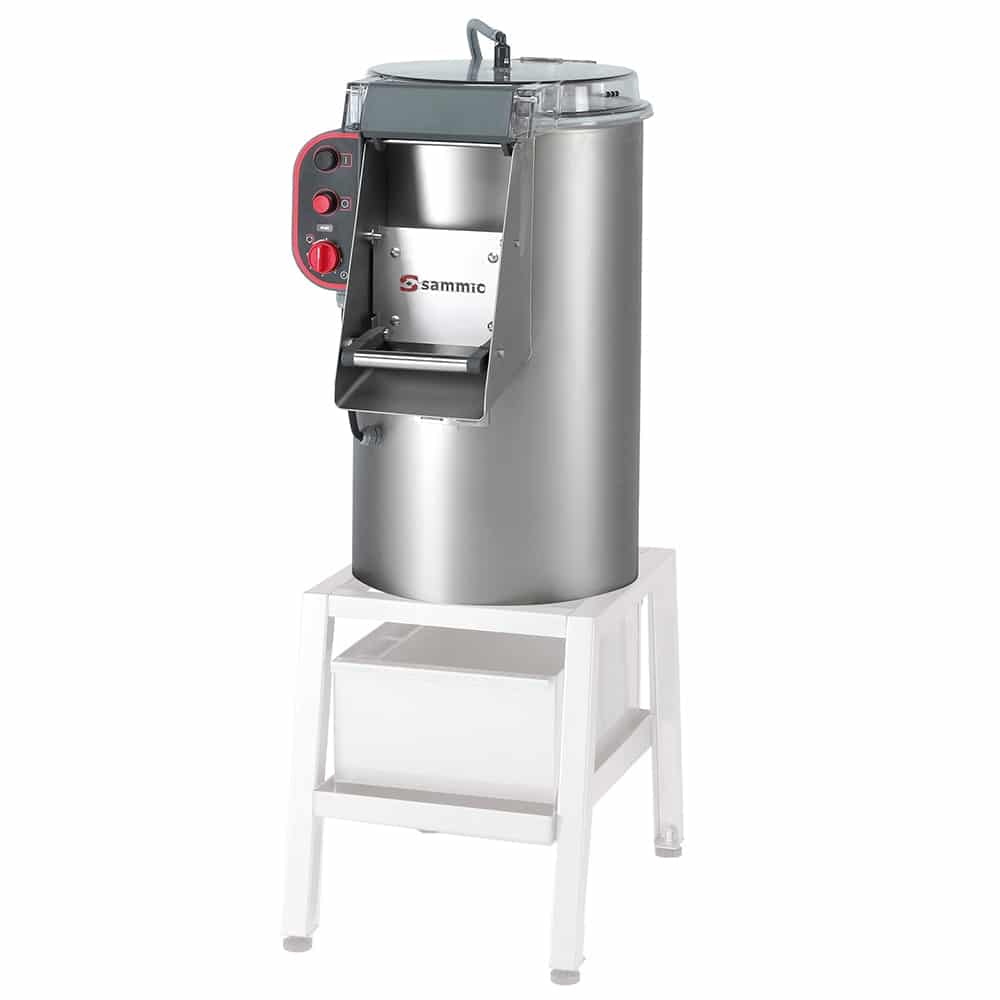 To save time in food prep, the Sammic PI-20 (1000618) potato peeler accommodates 44 pounds of potatoes per cycle and can peel between 800 and 950 pounds per hour. Operators can adjust peeling time as long as 6 minutes, and to prevent operational lag, this machine can peel continuously. Its aluminum base plate features a removable abrasive lining that acts as sandpaper to peel potatoes and other root vegetables in minutes. Lateral stirrers move whole potatoes across the base, while sidewall plates reincorporate potatoes for uniform peeling.