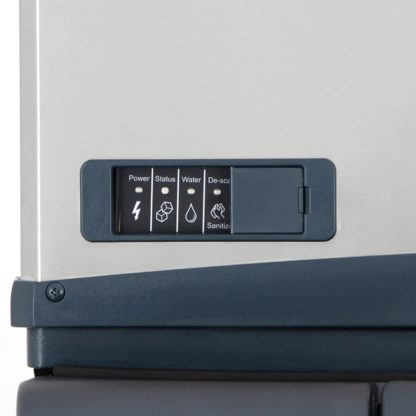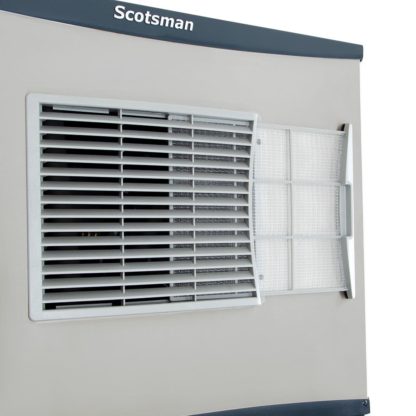 The Scotsman C0330MA-1/B330P Prodigy Plus ice cube machine and bin have a stainless steel exterior with a metallic finish to resist scratches and dents. This unit can make 400 pounds of ice and has a Harvest Assist feature that pushes ice into the bin with hot gas and a probe. It has an air-cooled, self-contained refrigeration system and an air filter located at the front to improve air circulation, while the WaterSense purge control feature adjusts water quality to reduce scale buildup. Technical service and warranty information is provided to the user with the QR code on the front of the unit. Antimicrobial technology is built-in to keep the machine sanitized between cleanings, and all of the internal components are accessible through the removable, self-aligning front panel.
