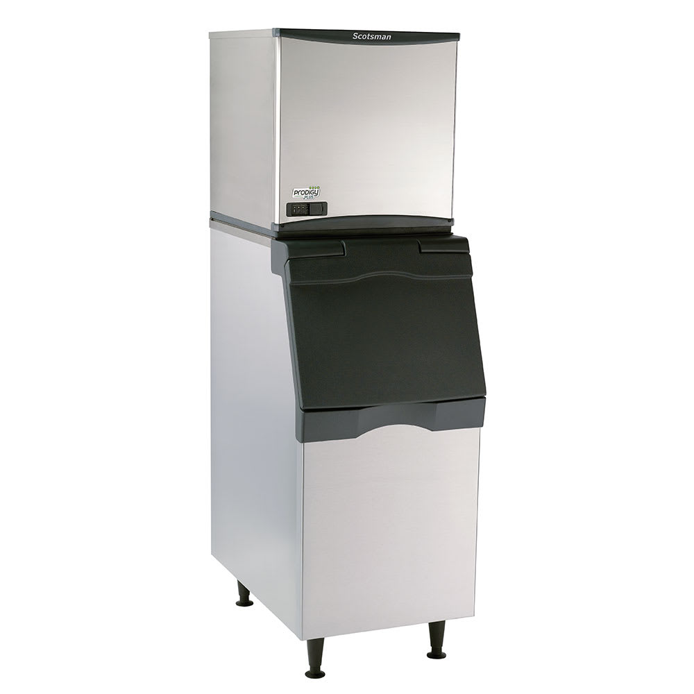 C0522SA-1 Ice Maker: Prodigy Plus Ice Maker, cube style, air-cooled, self-contained condenser, production capacity up to 475 lb/24 hours at 70°/50° (340 lb AHRI certified at 90°/70°), stainless steel finish, small cube size, 115v/60/1-ph, 13.5 amps, cULus, NSF, CE; B322S Ice Bin: Ice Bin, top-hinged front-opening door, 370 lb application capacity, for top-mounted ice maker, polyethylene liner, metallic finish exterior, includes 6″ legs, NSF