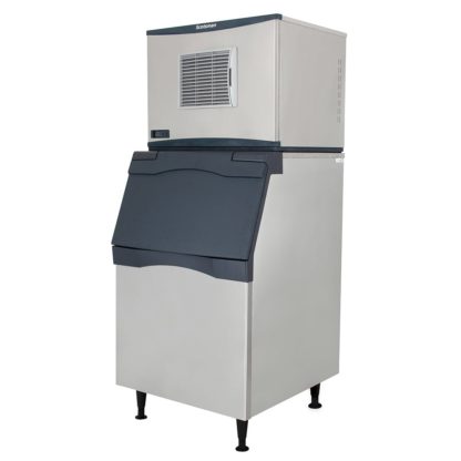 The storage bin can hold 420 pounds of ice. Ice melts slowly since the bin is insulated with foam polyurethane between the interior liner and wall. The spring-loaded door makes opening and closing the door easier. An ice scoop is included, and a scoop holder is built into the storage bin. The Scotsman C0630SA-32/B530P Prodigy Plus half cube ice maker with storage bin uses R-404A refrigerant to maintain cool temperatures.