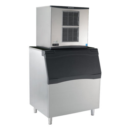 The Scotsman C0630SA-32/B842S/KBT29 ice maker with bin can produce 640 pounds of ice and store 788 pounds. It can be cleaned with the push of a button and makes half-cube ice, which has a versatile shape that is perfect for drinks. Between cleanings, an antimicrobial agent slows bacteria growth while purge control removes scale buildup. Operators can track the operating status by monitoring the indicator lights.