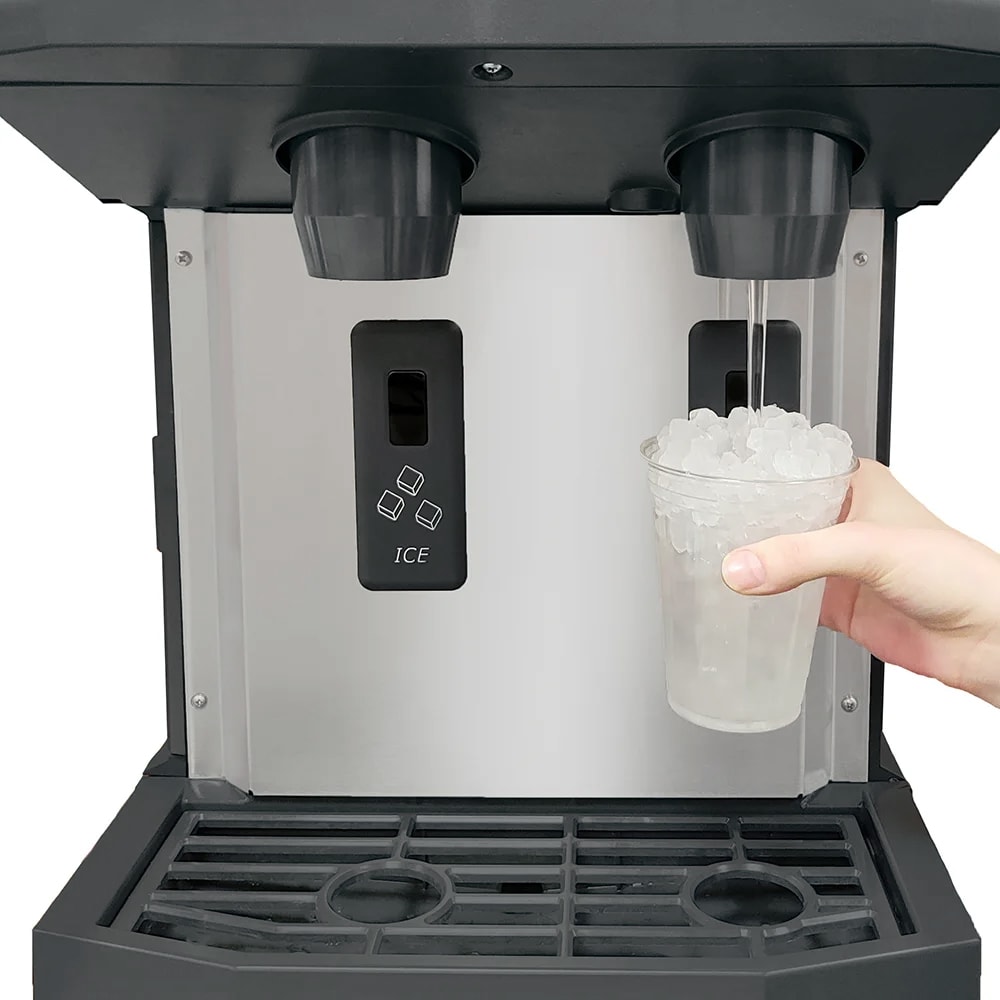 Durable to support everyday use, the Scotsman HID312AB-1 ice and water dispenser’s auger, evaporator, and exterior panels are made of stainless steel-a rust- and corrosion-resistant metal that’s simple to clean. At the push of a button, it dispenses water and chewable, absorbent nugget ice. Its buttons and other key components are treated with antimicrobial agent to inhibit bacterial, mildew, and fungal growth. To optimize sanitation, its bin, air filter, spouts, sink, and grill can be removed to enable thorough cleaning.