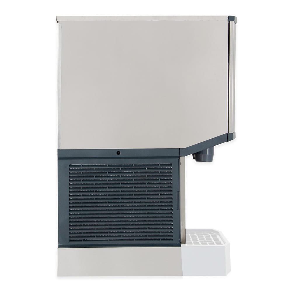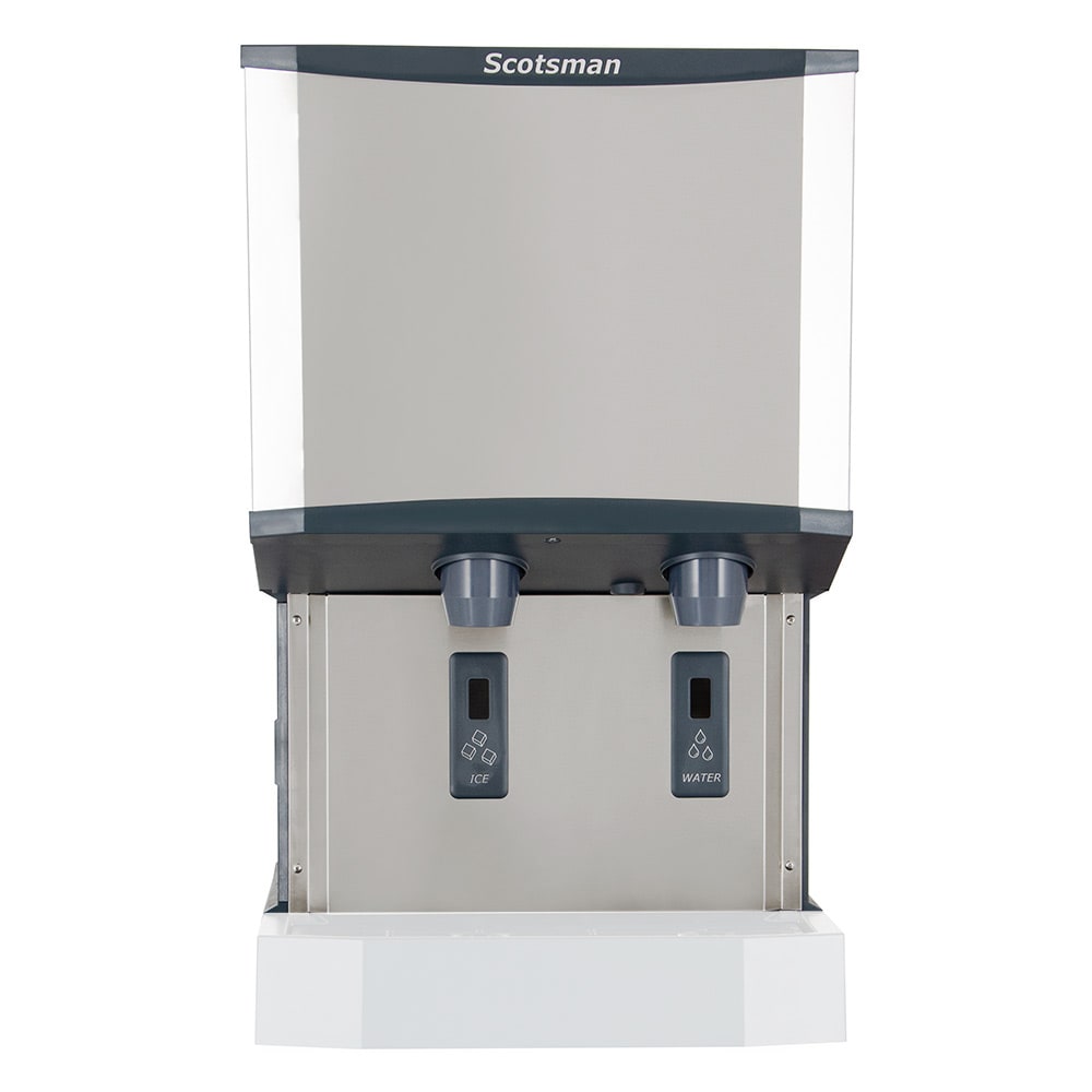 The Scotsman HID540AW-1 wall-mount water and ice dispenser produces as much as 500 pounds of ice in ideal conditions. Its front panel can be removed for internal servicing, as can the dispenser’s air filter, spouts, and bin. This bin holds 40 pounds of ice before it is dispensed.
