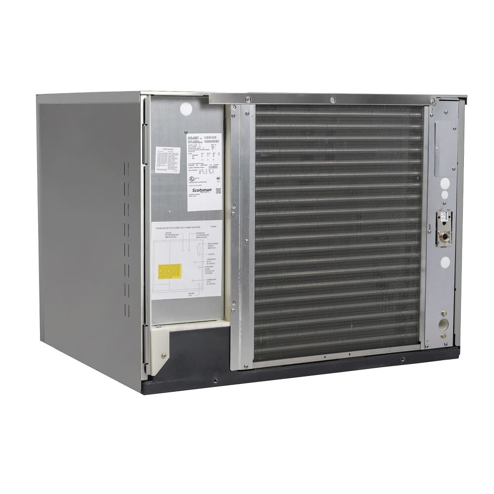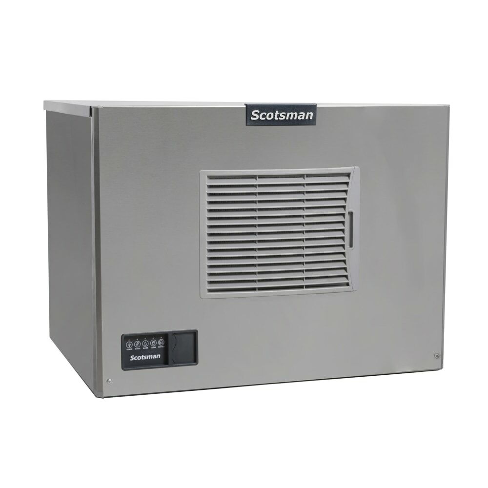 In ideal conditions, the Scotsman MC0630MA-32 full cube ice machine head produces 640 pounds of ice in 24 hours. It makes medium-sized cubes, which are often used in drinks for restaurants and bars. Because the unit is air cooled, it uses air from the room to cool the refrigerant and form ice cubes in the evaporator plate. After ice is made, harvest assist pushes a pin through the evaporator plate to force ice into the bin.