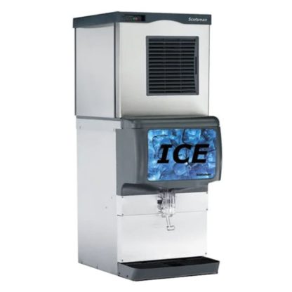 The Scotsman NS0622A-1/ID150B-1/KBT42 nugget ice maker with dispenser is designed for countertop use and is activated when a cup is pushed into the dispenser. This dispenser accommodates 150 pounds of ice and has an insulated drip tray that catches spillage to keep the countertop clean. For maintenance, the components can be accessed from the front. The ice machine produces 643 pounds per day, but if ambient temperatures are higher than expected, it makes closer to 547 pounds daily.