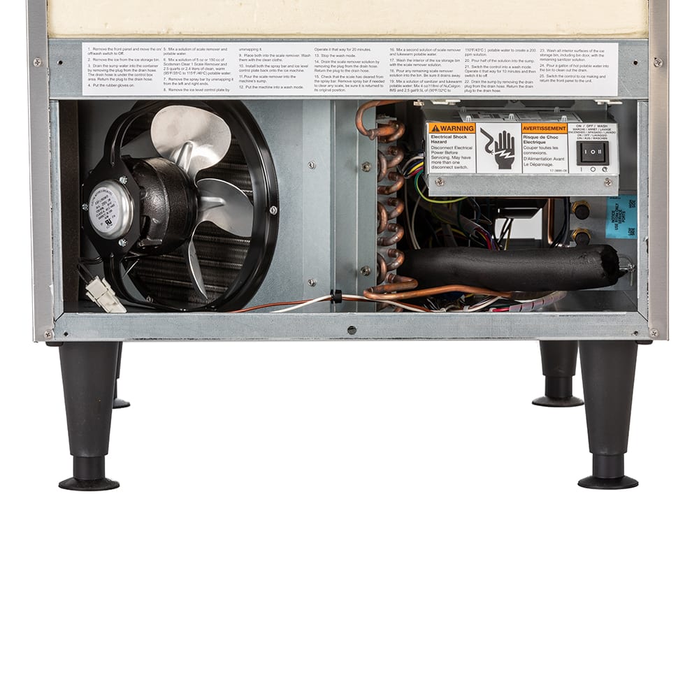 Undercounter Ice Maker With Bin, 24″W, cube style, air-cooled, self-contained condenser, production capacity up to 282 lb/24 hours at 70°/50° (210 lb AHRI certified at 90°/70°), 80 lb bin storage capacity, ergonomic slide-back door, recessed utility chase, front accessible external removable air filter, alluminum alloy side panels, small cube size, R-134A refrigerant, includes 6″ legs, 24″W x 28.5″D x 39″H, 115v/60/1-ph, 15 amps, NSF, cULus, Made in USA, AHRI Certified