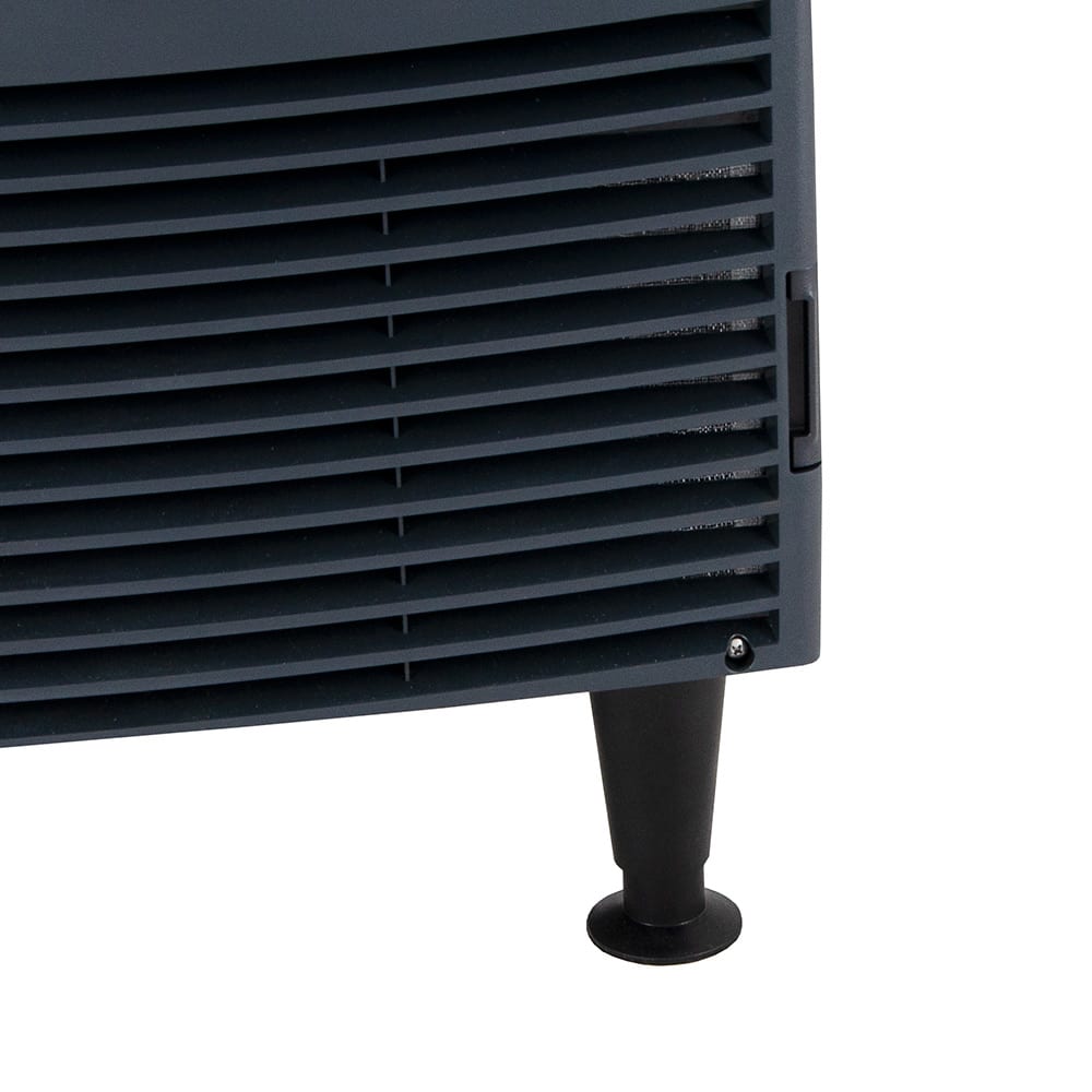 The Scotsman UN324W-1 commercial undercounter ice maker produces as much as 340 pounds of nugget ice in 24 hours under ambient conditions-a soft and chewable ice optimal for blended beverages, such as smoothies and margaritas. This compact unit can store as much as 80 pounds of ice. Its 6-inch legs can be adjusted to level the ice maker on uneven floors, and for facilitated maintenance, this unit comes with a QR code that gives operators access to warranty history and service manuals. With its water-cooled configuration, the ice maker cools itself by pumping cool water near the condenser coils.