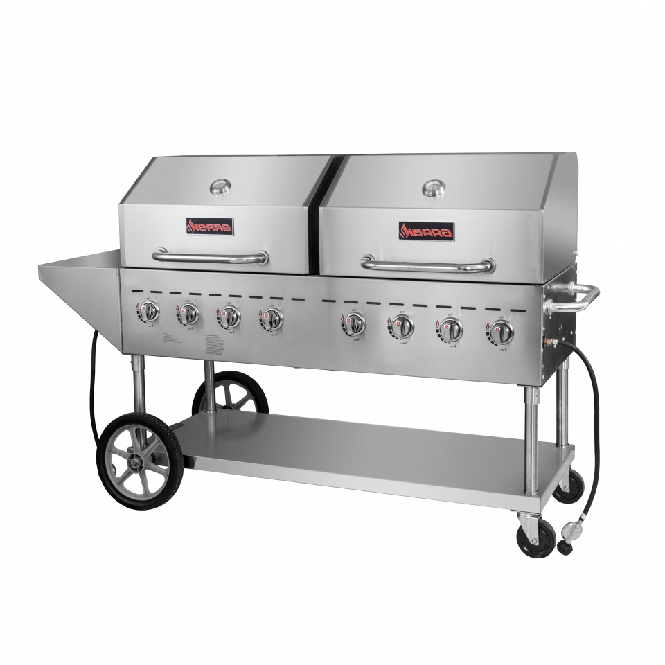 Cater to company picnics, tailgate parties, wedding receptions, and other outdoor events with the Sierra Range SRBQ-60 commercial outdoor gas grill. This 80 wide model comes with 8 stainless steel tube burners that deliver 120,000 BTU heat output. A sturdy stainless steel body, hood, and base provides added durability and protects against rust and corrosion.