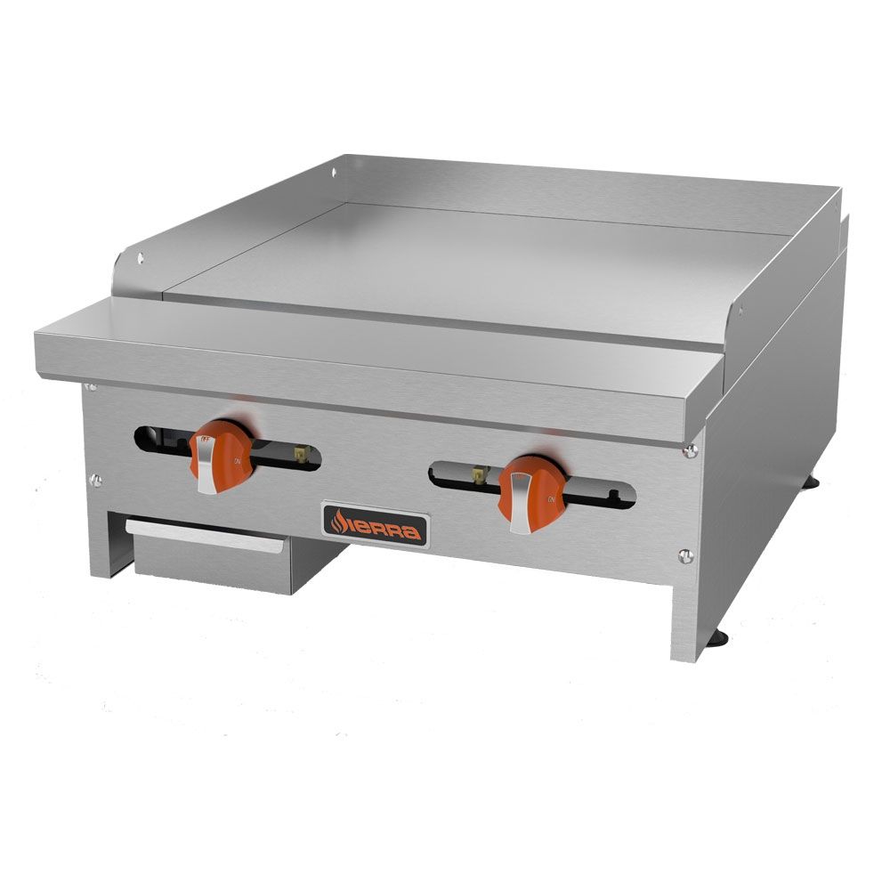 The Sierra SRMG-24 is a 24″ wide professional griddle with 3/4″ thick highly polished steel griddle plates, 2 burners, and 46,000 BTU of total heating power. This manual griddle also features 4″stainless steel adjustable legs, 6″ landing edge for increase plate stability, removable grease tray, and a 2-5/8 wide grease trough for easier cleaning. The rugged stainless steel exterior body is easy to clean and protects the unit from rust and corrosion. What’s more, a stainless steel standing pilot for each flute ensures instant ignition.