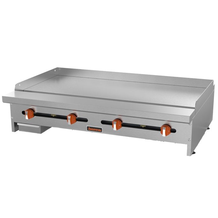 The Sierra SRMG-48 is a 48″ wide professional griddle with 3/4″ thick highly polished steel griddle plates, 4 burners, and 92,000 BTU of total heating power. This manual griddle also features 4″stainless steel adjustable legs, 6″ landing edge for increase plate stability, removable grease tray, and a 2-5/8 wide grease trough for easier cleaning. The rugged stainless steel exterior body is easy to clean and protects the unit from rust and corrosion. What’s more, a stainless steel standing pilot for each flute ensures instant ignition.