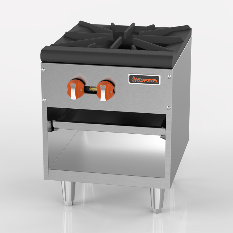 Heat chili, soups, and stews with the Sierra Range SRSP-18 stock pot range & burner. This 18″ restaurant range comes with a single 3-ring cast iron burner and delivers a 100,000 BTU of heating power. It features a heavy gauge welded front frame, lift-off burner for easier cleaning, a full-width drip tray to catch spills, adjustable stainless steel legs, and a sturdy lower cabinet storage cavity.