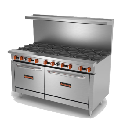The Sierra Ranges feature an all-stainless steel interior and exterior construction, except for the porcelain oven decks and oven door liners which allow for the easiest clean-ups. The SR-10-60 has the flexibility to suit every operation. This range has 10-30,000 BTU heavy duty cast iron top burners and 2-32,000 BTU ovens, each accepting 18″ x 26″ sheet pans. The two independent ovens feature “U” type burners and temperatures are adjustable from 250°F (121°C) to 550°F (288°C)