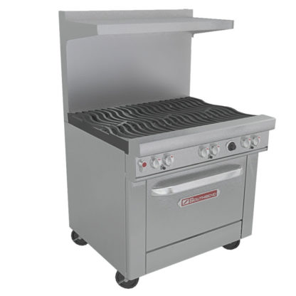 Ultimate Restaurant Range, natural gas, 36″, (6) non-clog burners, wavy grates, standing pilot, (1) standard oven with battery spark ignition, includes (1) rack, 22-1/2″ flue riser with shelf, stainless steel front, sides, shelf & 6″ adjustable legs, 207,000 BTU, CSA, NSF