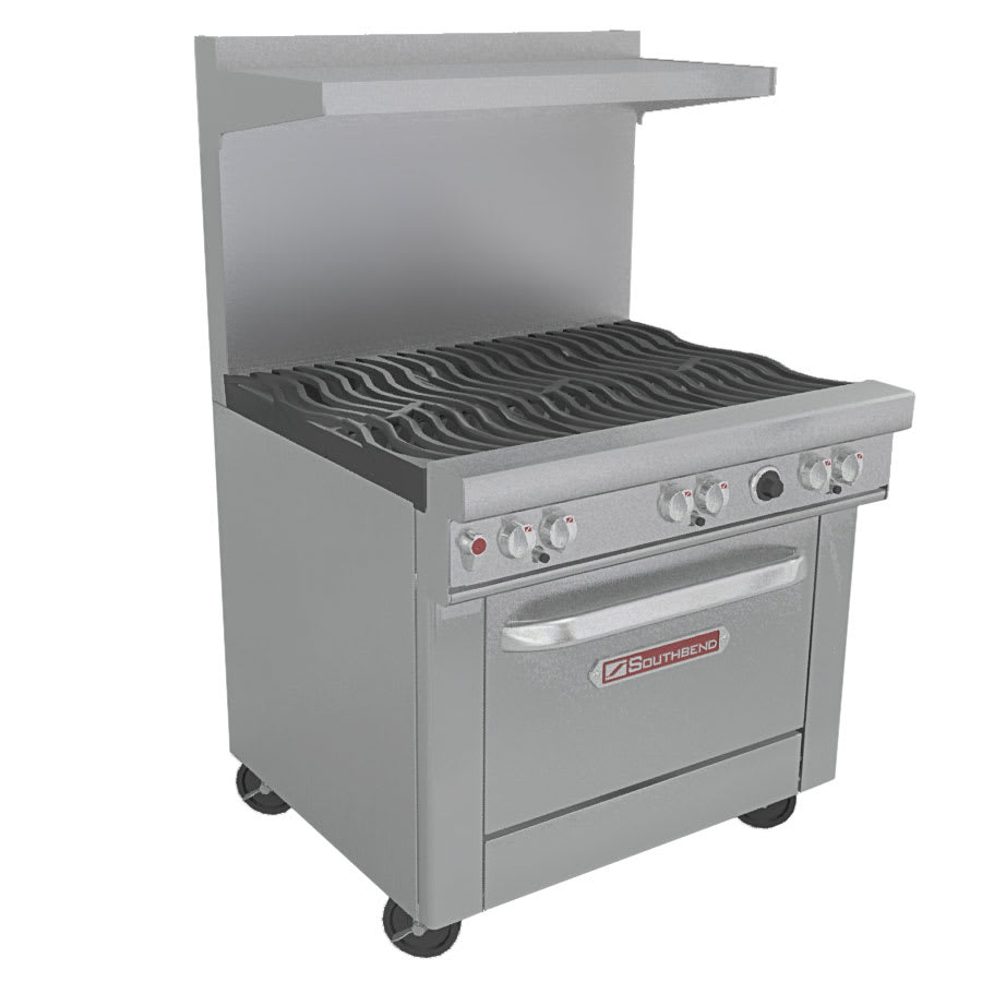 The Southbend 4362D NG Ultimate restaurant range has a 32,000 BTU convection oven equipped with a battery spark ignition. The oven has a thermostat range of 175 to 550 degrees Fahrenheit. The oven interior is made from porcelain enamel for excellent ability to be cleaned and to prevent corrosion. The corners are coved instead of square so cleaning debris out is a much easier task. Airflow in the oven is improved so hot and cold spots are prevented, ensuring food is evenly heated without burning. This particular model comes with wavy grates and 27,000 BTU non-clog burners. Since the grates are wavy, the entire range top can be used to cook instead of six specific spots. For better cooking and heating efficiency, the burners feature a cast bowl design. The Southbend 4362D NG Ultimate restaurant range is heated by natural gas.