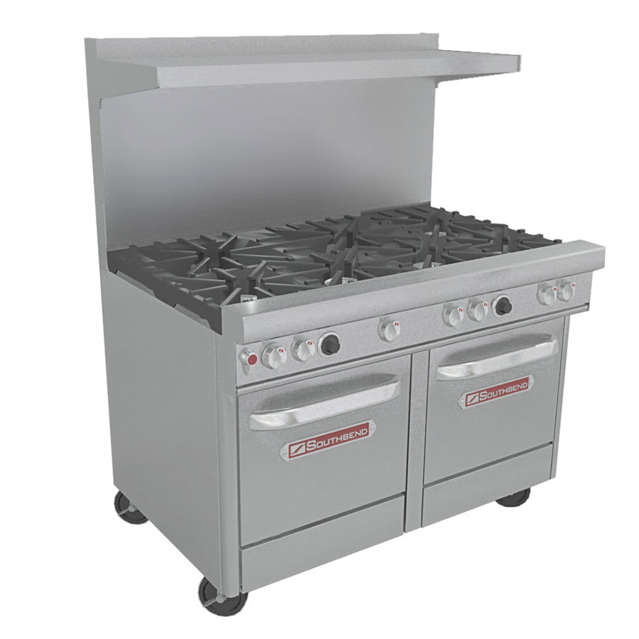 Ultimate Restaurant Range, 48″, (3) star/sauté burners front left, (2) pyromax burners rear left, (1) star/sauté burner front right, (1) non-clog rear right, standing pilot, (2) space saver ovens with battery spark ignition, includes (1) rack per oven, 22-1/2″ flue riser with shelf, stainless steel front, sides, shelf & 6″ adjustable legs, 335,000 BTU, CSA, NSF