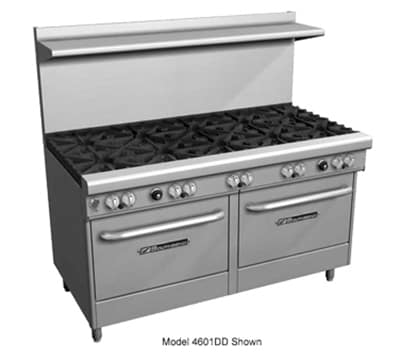 Ultimate Restaurant Range, 60″, (2) non-clog burners, wavy grates, (1) 48″ griddle left, thermostatic controls, standing pilot, (2) convection ovens with battery spark ignition, includes (3) racks per oven, 22-1/2″ flue riser with shelf, stainless steel front, sides, shelf & 6″ adjustable legs, 198,000 BTU, CSA, NSF