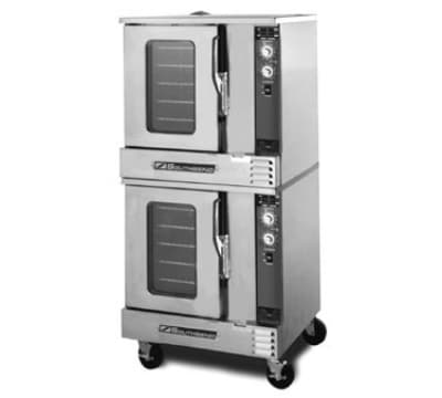 The Southbend EH/20SC half-size convection oven uses a dual-speed fan system to push hot air around its cooking chambers—this diffuses cold spots to ensure food receives even heat. This oven has two cooking chambers, doubling its output to help busy restaurant kitchens keep up with customer flow. Each chamber has five adjustable racks with 11 different positions.