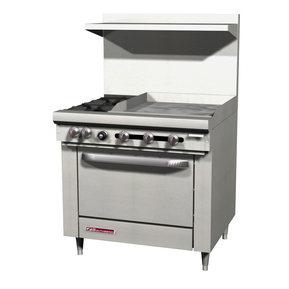The Southbend S36D-2GR S-Series gas range has two open burners on the left, a 24-inch-wide griddle on the right, and a standard oven in the base. For strength, the open burners are made of one piece of cast iron, and cast iron grates sit over them to hold cookware directly over the heat source. A 14-inch-diameter stockpot fits on the rear grate, while the griddle plate is 0.5 inch thick and is made of polished steel. Because of the combination of burners and a griddle plate, this unit places two of the most common cooking surfaces in a convenient footprint. Along the front, a 4-inch-deep rail holds plates while keeping operators separate from hot surfaces.