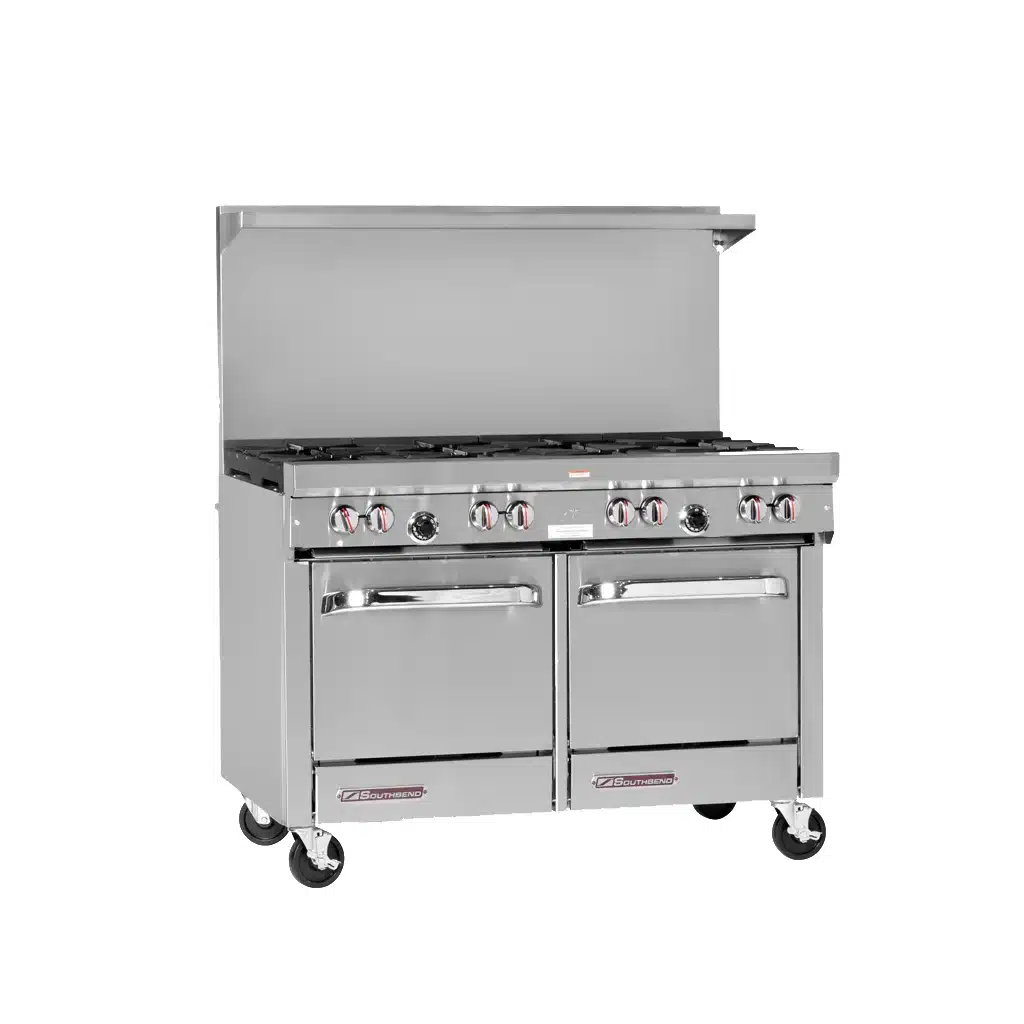 The Southbend S48EE commercial range features eight open burners and two space-saver ovens. Its cast iron burners are heavy duty and durable, resulting in faster heating and cooking times. With front, sides, and a removable shelf made of dent- and corrosion-resistant stainless steel, this unit is durable and easy to clean.