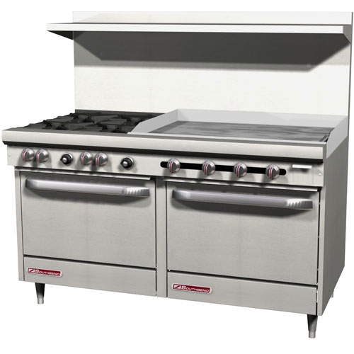 The 60″ Commercial Restaurant Range S60DD-3G from Southbend features four open burners, a griddle, and two standard ovens. Each of the burners packs 28,000 BTU and feature Southbend’s patented, one-piece cast iron, non-clog design with a lifetime warranty. Their cast-iron grate tops are removable and rear tops are larger to accommodate stock pots and similar sized cookware. The range top is rounded out with a 36-inch wide griddle. But the firepower doesn′t end there. Each oven boasts 35,000 BTU and a U-shaped heavy-duty burner for even heat distribution. The ovens’ interiors are enameled to resist corrosion and insulated with heavy, self-supporting block type rock wool to contain heat. The S60DD-3G Commercial Restaurant Range from Southbend brings confidence and power to the commercial kitchen.
