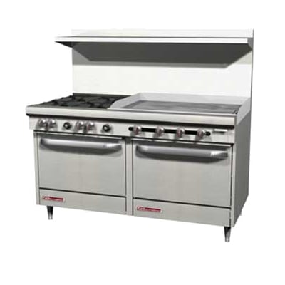 The Southbend S60DD-3GR gas range has four one-piece burners that are controlled manually with knobs. Made of cast iron, the burners and grates are durable for heavy use, and stock pots measuring as big as 14 inches diameter fit on the rear grates. A 36-inch griddle on the range top measures 1 inch thick to resist warping, and, to keep liquids and crumbs contained to the cooking surface, the griddle plate has raised sides. To provide a place for staff to set dishes as they plate food, there is a 4-inch front rail.