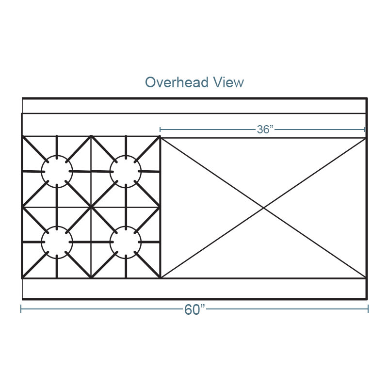 - (4) 24,000 BTU, 1-piece, non-clog burners have manual controls that read “Low, Medium, and High”