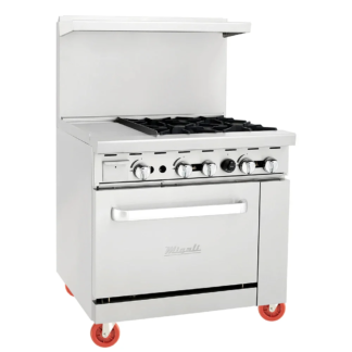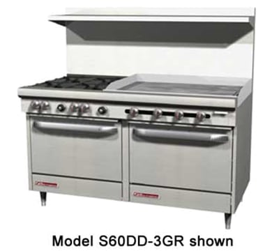 S-Series Restaurant Range, 60″, (2) 28,000 BTU open burners, (1) 48″ griddle left, manual controls, (2) standard ovens, snap action thermostat, removable cast iron grates, (2) crumb drawers & shelf, hinged lower valve panel, includes (1) rack per oven, stainless steel front, sides, shelf, 4″ front rail & 6″ adjustable legs, 206,000 BTU, cCSAus, CSA Flame, CSA Star, NSF