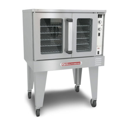 Equipped with solid-state controls, the Southbend SLGB/12SC convection oven is straightforward to operate. Its temperature is adjustable within the range of 140 to 500 degrees Fahrenheit, and the mechanical timer has a limit of 60 minutes.