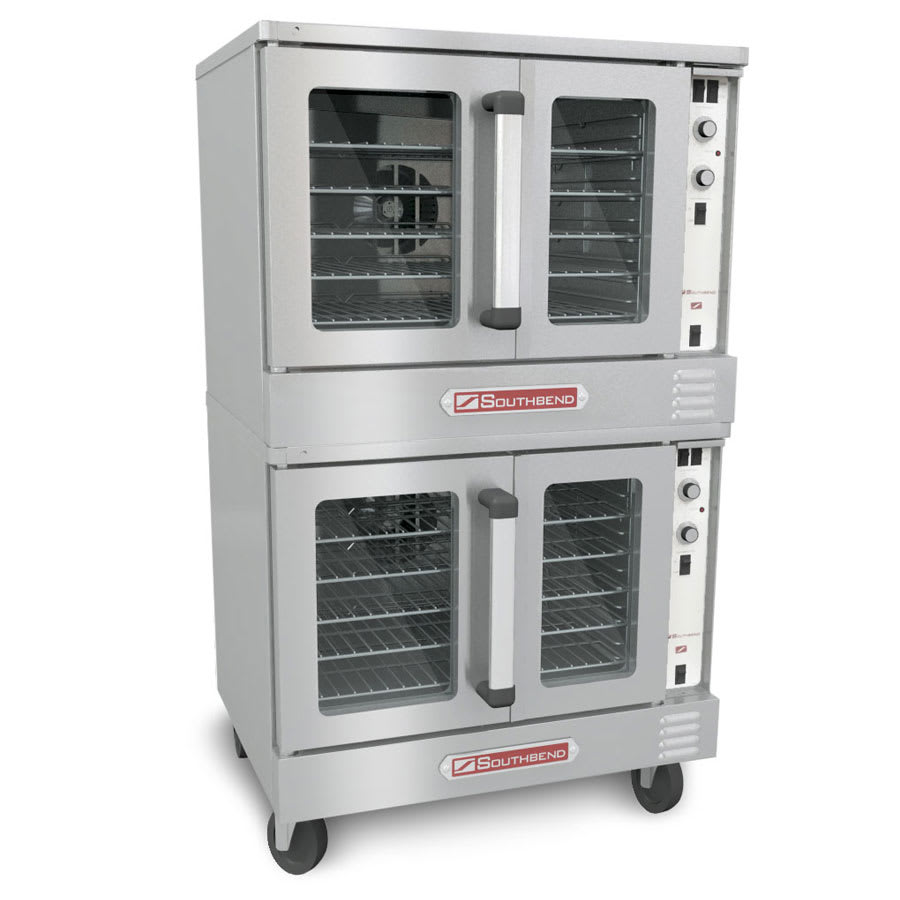 The Southbend SLGB/22SC deep-depth convection oven is made of stainless steel to withstand heavy use in commercial settings. The dependent doors open 180 degrees to make loading and unloading pans simple. Both handles stay cool to help prevent injuries, and a dual seal system prevents heat from escaping around the doors. Glass windows in the doors enable staff to see inside the cabinet and check on product without letting heat escape. Interior lights also help with visibility.