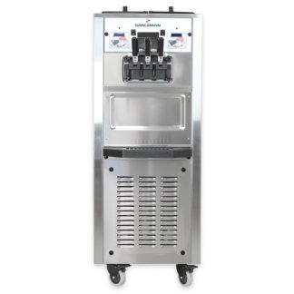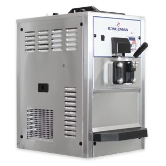 The Spaceman 6235A-C soft-serve machine can serve two flavors from dual 1.8-quart freezing cylinders and has a third dispensing head to allow for a twist option. The two 6-quart hoppers automatically feed the mix into the cylinders and a low-mix indicator light alerts the operator when a refill is necessary. The unit’s digital temperature displays (one for each barrel) and automatic microprocessor make it easy to ensure a high-quality product is served every time. The Spaceman 6235A-C soft-serve machine can provide 385 4-ounce servings per hour and has a standby mode that keeps product fresh during slow periods and even overnight while reducing the unit’s electrical demands.