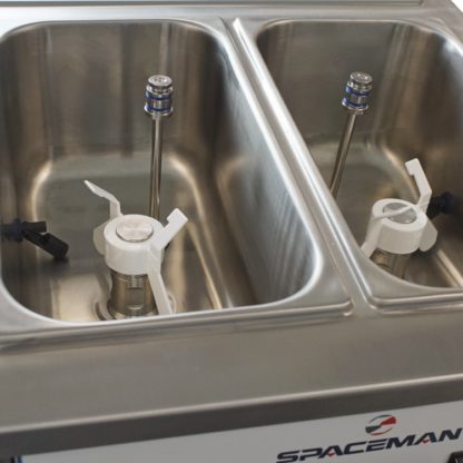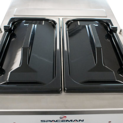 The 6235-C is a premium twin twist (two flavor) countertop, gravity fed soft serve machine. Capable of producing a variety of soft serve products including ice cream, frozen yogurt, custards, and sorbets. Easy to use dual digital user interface and control system maintains excellent product consistency, hopper temperature, and high-performance parameters. Hopper refrigeration and sleep/standby feature keep product fresh and is approved for dairy or non-dairy products. Hopper agitators stir product throughout the day, saving operator time and ensuring consistent dairy safe cooling in the hopper. Patented freezing technology on the 1.8qt cylinders means a super-fast recovery time, capable of producing over 350 small 4oz servings per hour. Spaceman soft serve freezers have patented technology to prepare and freeze product faster and more efficiently than any competitor. Spaceman’s revolutionary V2 beater and PAR (product to air ratio) system reduces wearable parts by over 25% while improving product quality and overrun control. The V2 beater and blade system scrape the cylinder walls to ensure less ice buildup – creating smoother, creamier product. Simultaneously, the V2 beater helix creates a vacuum, pulling product and air into the freezing cylinder with precise product to air ratio. The V2 beater and air tube system has been tested to hold overrun for a longer period than other gravity fed systems…