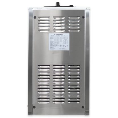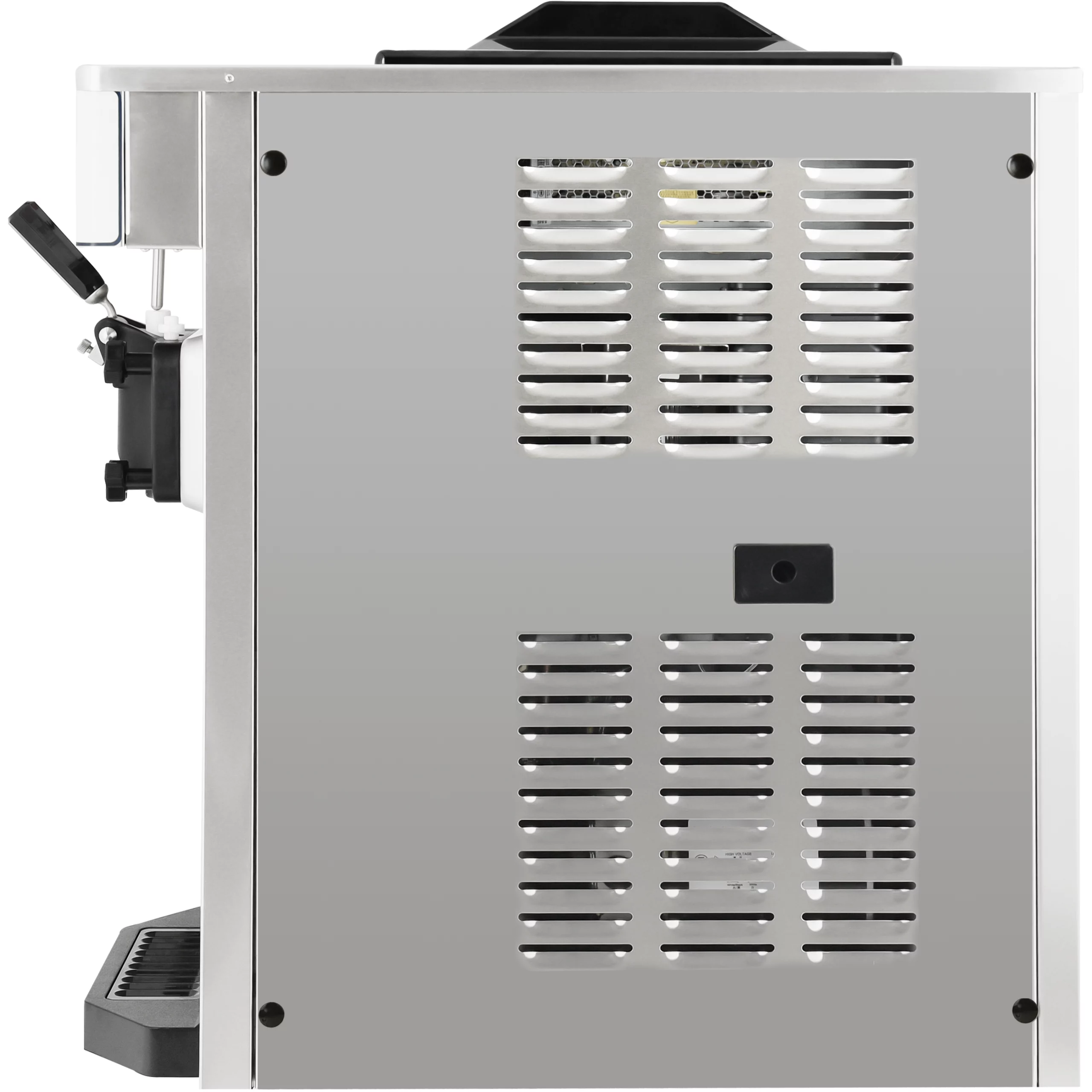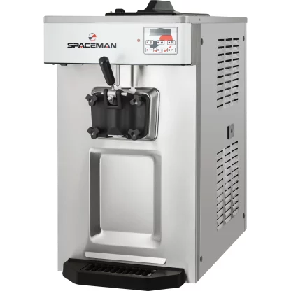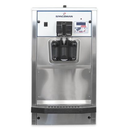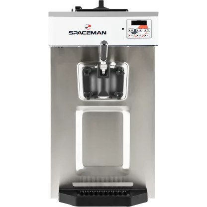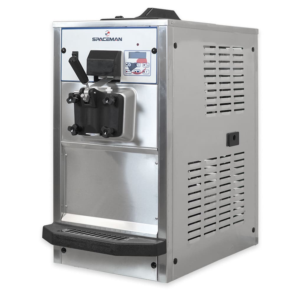 The 6236-C is a high-volume single flavor countertop, gravity fed soft serve machine. The 6236-C will outperform any competitors single flavor countertop machine in initial freeze time, recovery time, and servings per hour. The 6236-C is ideal for high volume operations with servings up to 12oz. Capable of producing a variety of soft serve products including ice cream, frozen yogurt, custards, and sorbets. Easy to use digital user interface and control system maintains excellent product consistency, hopper temperature, and high-performance parameters. Hopper refrigeration and sleep/standby feature keep product fresh and is approved for dairy or non-dairy products. Hopper agitators stir product throughout the day, saving operator time and ensuring consistent dairy safe cooling in the hopper. Patented freezing technology on the 3.4qt cylinders means a super-fast recovery time, capable of producing over 350 4oz servings per hour. Spaceman soft serve freezers have patented technology to prepare and freeze product faster and more efficiently than any competitor. Spaceman’s revolutionary V2 beater and PAR (product to air ratio) system reduces wearable parts by over 25% while improving product quality and overrun control. The V2 beater and blade system scrape the cylinder walls to ensure less ice buildup – creating smoother, creamier product. Simultaneously, the V2 beater helix creates a vacuum, pulling product and air into the freezing cylinder with precise product to air ratio. The V2 beater and air tube system has been tested to hold overrun for a longer period than other gravity fed systems.