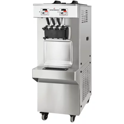 The 6378-C is a twin twist (two flavor) floor standing, gravity fed soft serve machine. Ideal for high volume locations with servings up to 12oz. Capable of producing a variety of soft serve products including ice cream, frozen yogurt, custards, and sorbets. Easy to use dual digital user interface and control system maintains excellent product consistency, hopper temperature, and high-performance parameters. Hopper refrigeration and sleep/standby feature keep product fresh and is approved for dairy or non-dairy products. Hopper agitators stir product throughout the day, saving operator time and ensuring consistent dairy safe cooling in the hopper. Patented freezing technology on the 3.4qt cylinders means a super-fast recovery time, capable of producing over 700 small 4oz servings per hour. Spaceman soft serve freezers have patented technology to prepare and freeze product faster and more efficiently than any competitor. Spaceman’s revolutionary V2 beater and PAR (product to air ratio) system reduces wearable parts by over 25% while improving product quality and overrun control. The V2 beater and blade system scrape the cylinder walls to ensure less ice buildup – creating smoother, creamier product. Simultaneously, the V2 beater helix creates a vacuum, pulling product and air into the freezing cylinder with precise product to air ratio. The V2 beater and air tube system has been tested to hold overrun for a longer period than other gravity fed systems.