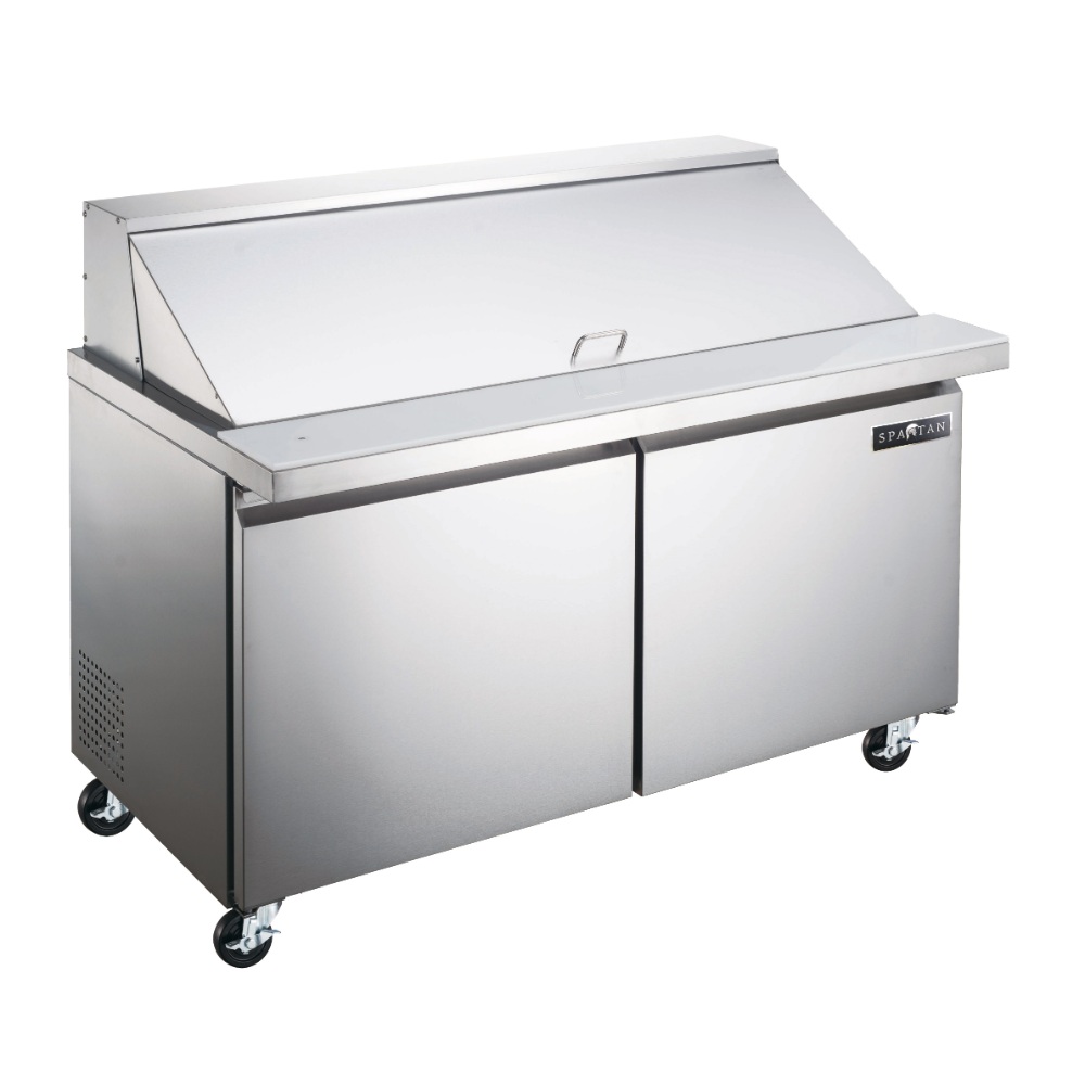This Spartan 46.75 inch 2 door 1/3 hp Mega Top Sandwich Prep Tables is the perfect size for any operation that wants to add signature sandwiches and salads to the menu, this prep table gives you the convenience of ingredient storage and plenty of prep space! It offers plenty of room to assemble your culinary creations while the refrigerated cabinet base below the work area gives you room to store extra ingredients, garnishes, condiments, or topping pans.