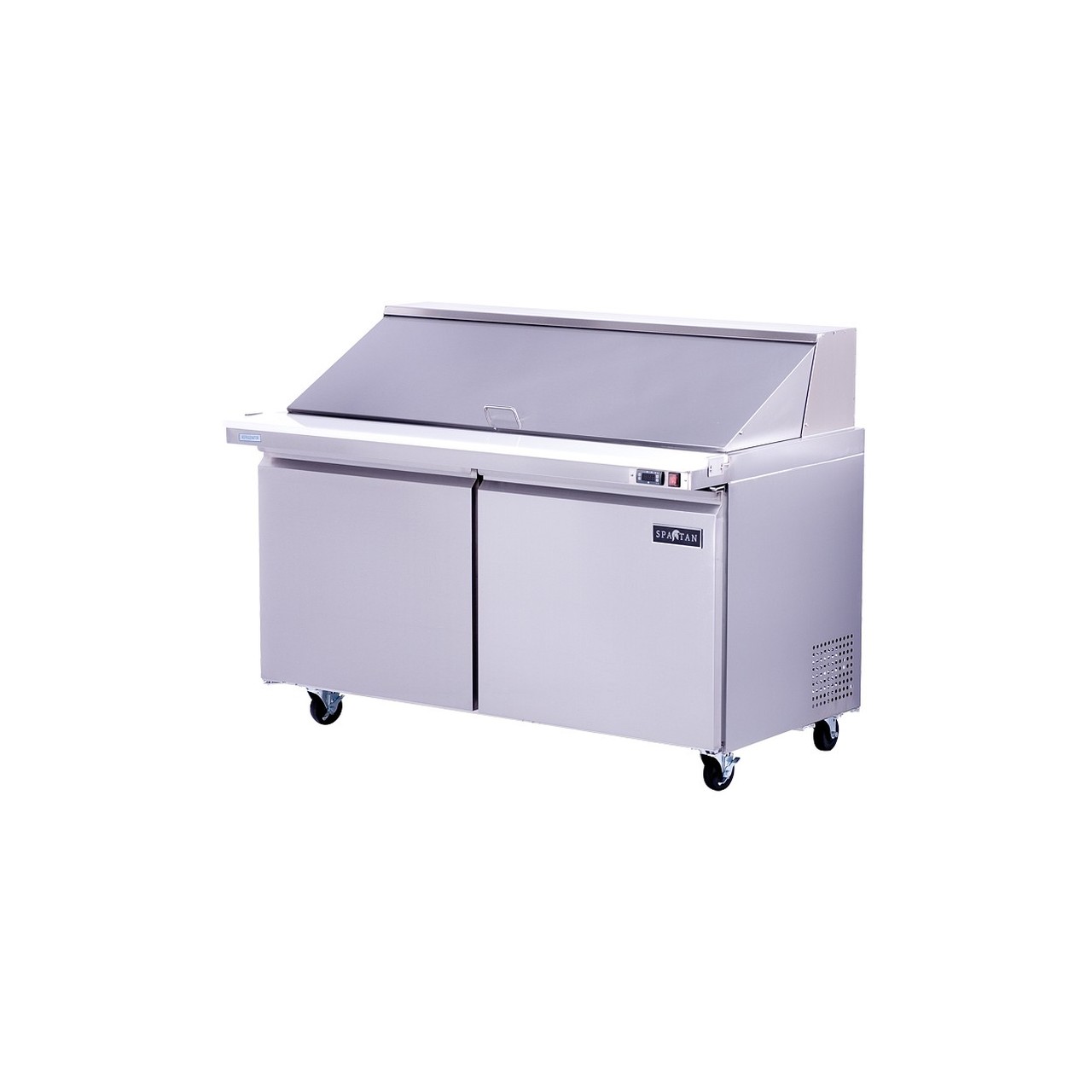 This Spartan 60″ 2 door 1/2 hp Mega Top Sandwich Prep Tables is the perfect size for any operation that wants to add signature sandwiches and salads to the menu, this prep table gives you the convenience of ingredient storage and plenty of prep space! It offers plenty of room to assemble your culinary creations while the refrigerated cabinet base below the work area gives you room to store extra ingredients, garnishes, condiments, or topping pans.