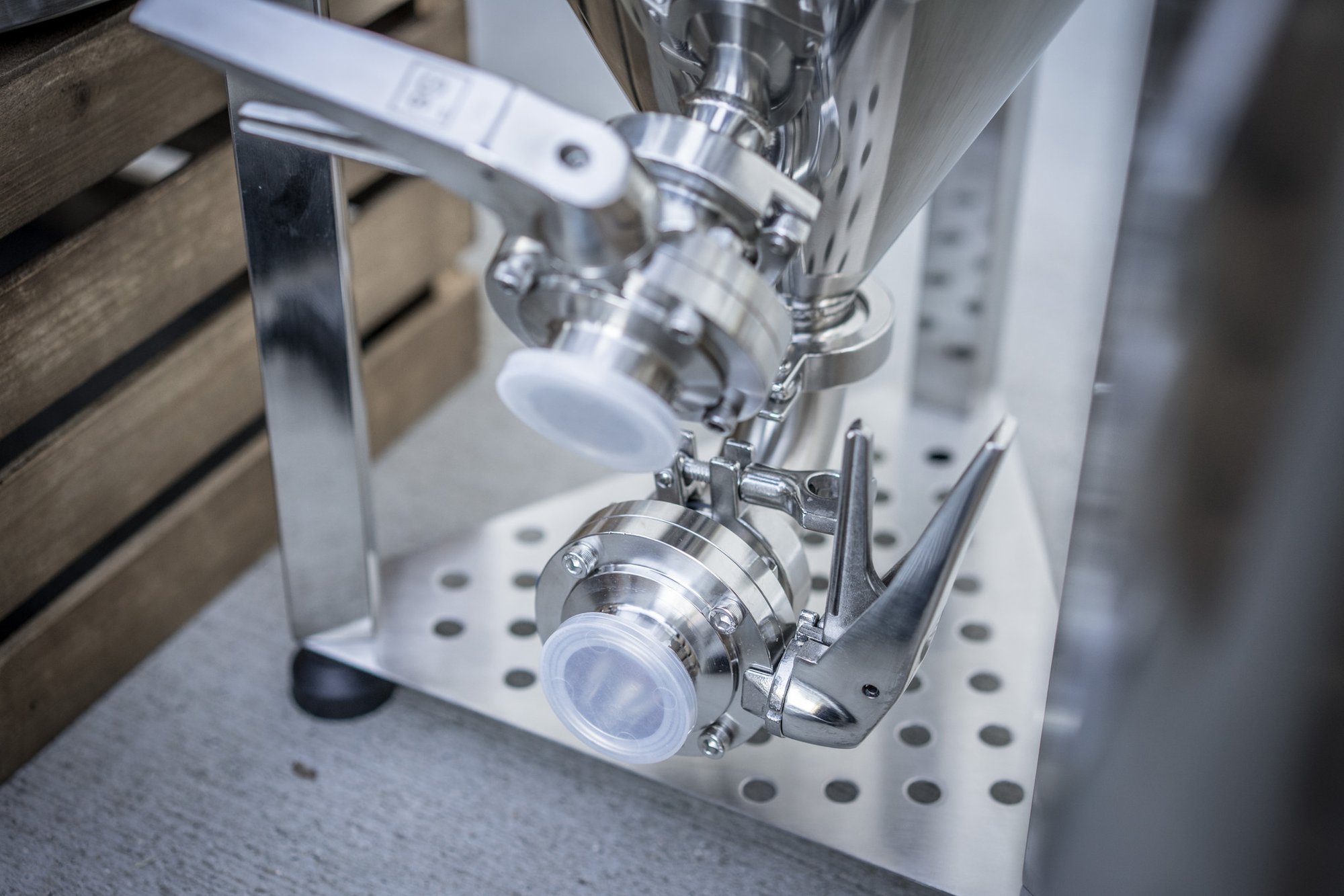 7. After fermentation slows (roughly 24-48 hours into primary fermentation), attach the 1.5″ TC to 1″ barb to the lower dump valve. Then dump any yeast and trub from the bottom valve into any container for disposal. Throughout fermentation, you may take gravity readings from the sampling valve on the upper part of your Chronical’s cone. Finally, once fermentation is complete, detach the Chronical from the FTS’s kit, and move to an elevated position. At this point, you can either bottle or keg from the racking valve. Remember that the racking arm is rotatable, so you can adjust that on the fly during transfer to avoid trub pickup.