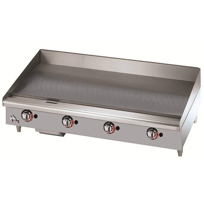 Star-Max manual gas griddles are a perfect match for the budget minded operator. For breakfast, lunch, or dinner, the Star-Max manual control griddles out-perform the competition. Star-Max griddles feature 1” thick polished steel griddle plate. 28,300 BTU aluminized burner every 12” of width controlled by a modulating thermostatic, 3/4” N.P.T. male gas connection with convertible pressure regulator, and 4” adjustable legs. Griddles operate on Natural gas.