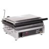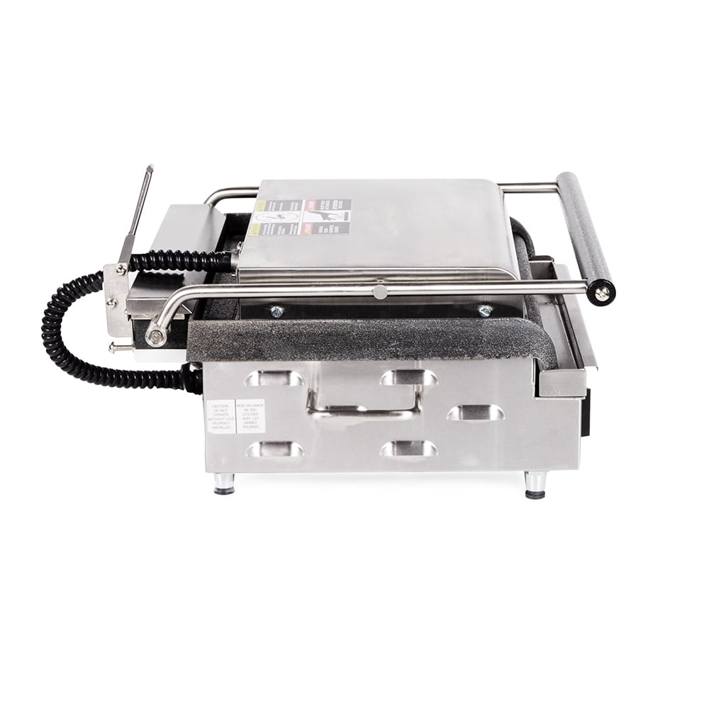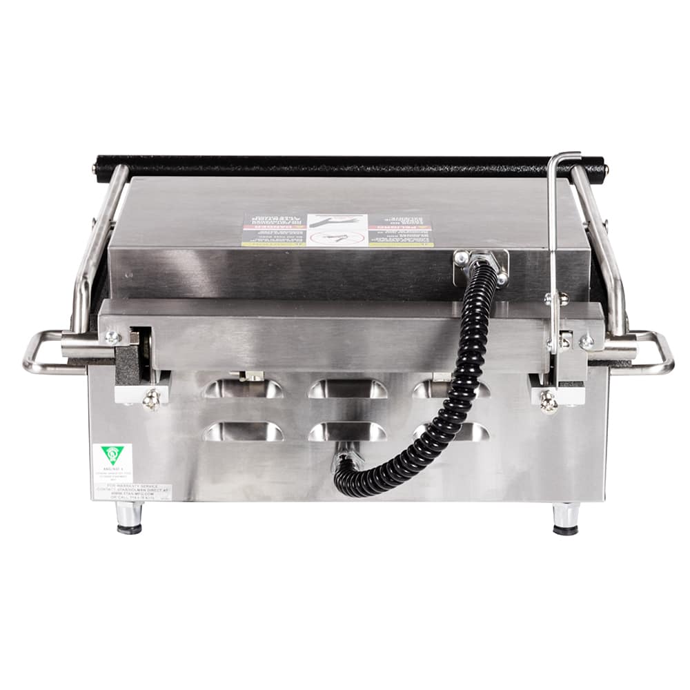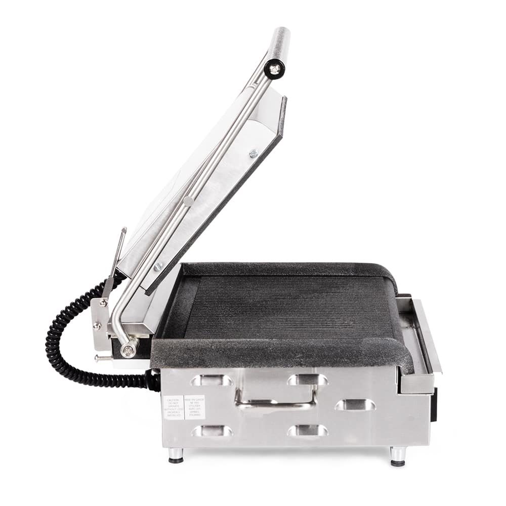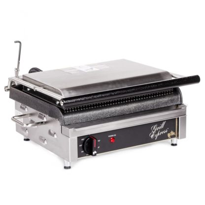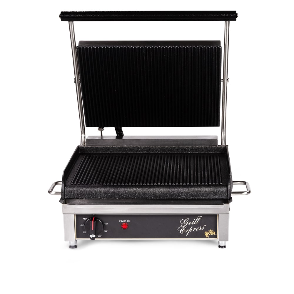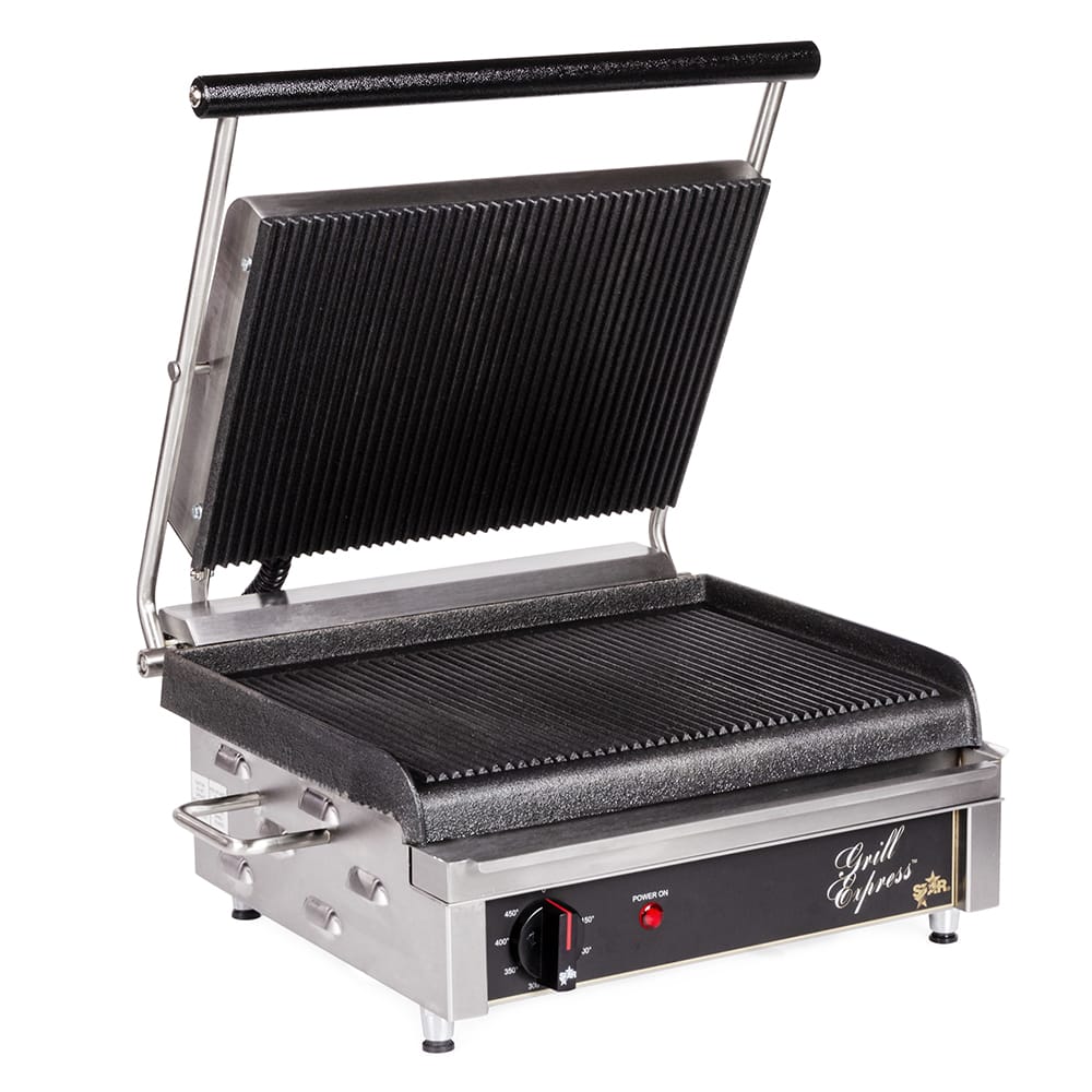 The Star Manufacturing GX14IG Grill Express Grooved Sandwich Grill is designed to offer reliable commercial-grade performance at an affordable price. These units feature grooved cast iron platens for increased durability. The temperature is controlled by an easy to use thermostat for quick adjustments from 175°F to 450°F (79°C to 232°C). The grill is ideal for fast and simple cooking of sandwiches, quesadillas, steak, chicken, or any other product that can be grilled. This product measures at 10.875 inches tall (21.8 inches open height) by 16.5 inches wide by 19.875 inches deep with a leg height of 1 inch. cULus, 120v, NEMA 5-15P
