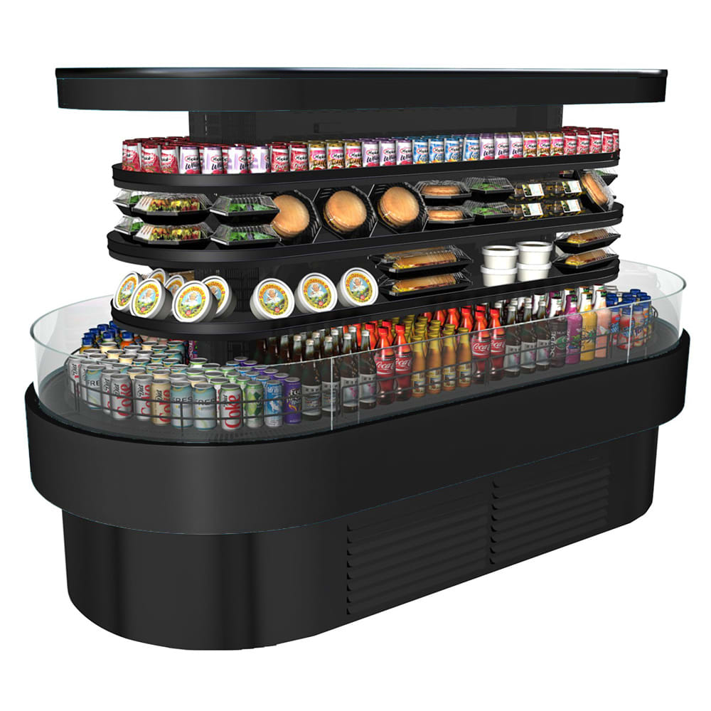 Oasis Refrigerated Self-Service Island, 99-3/4″W, 63″H, open air screen, (3) non-lit non-adjustable metal shelves, top light, black interior, includes price tag moulding (matches interior color), laminated exterior, rail system for shims, Breeze-E (Type ll) with EnergyWise self-contained refrigeration system, cETLus, ETL-Sanitation