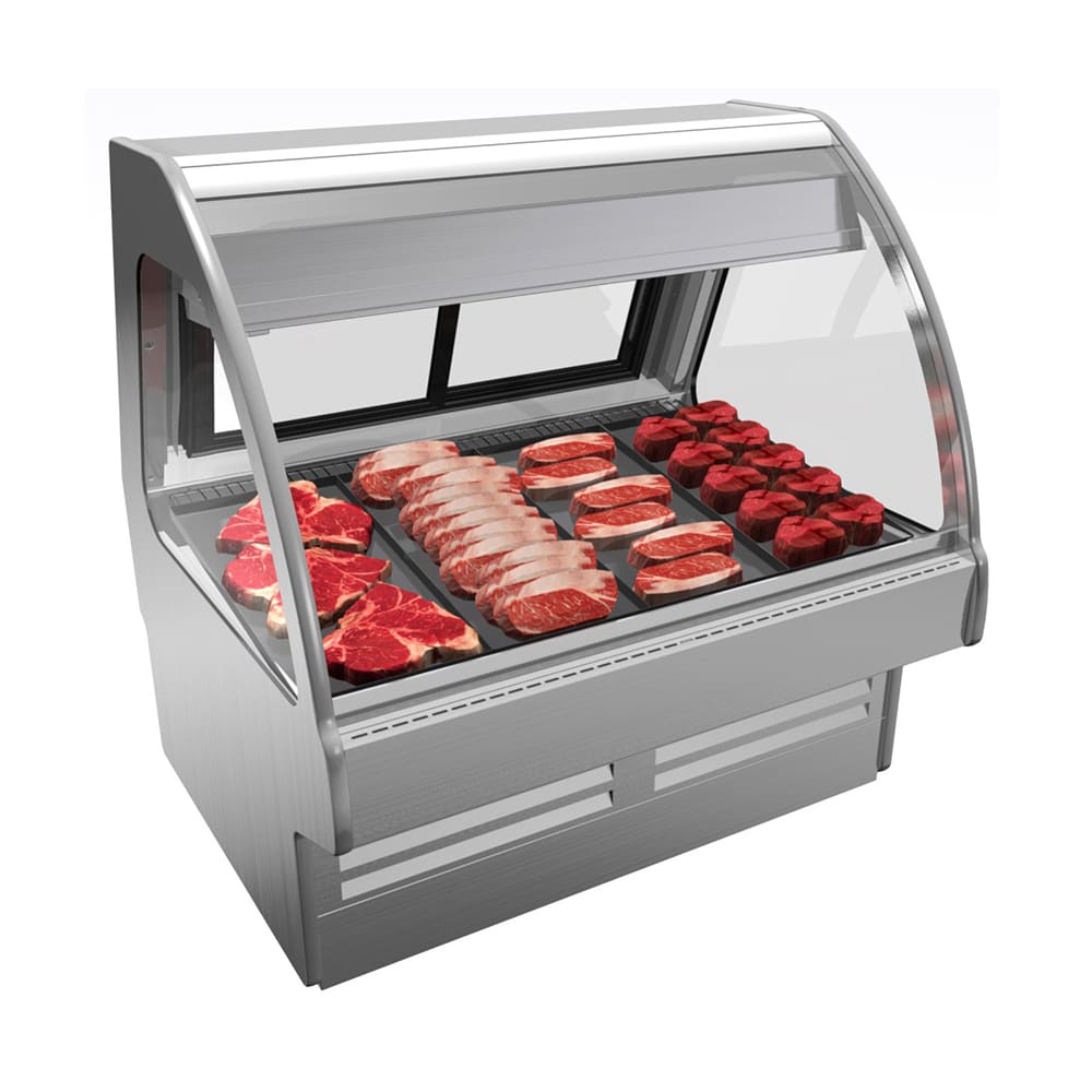 Fusion Refrigerated Service Meat/Seafood Case, 51″W, Breeze with EnergyWise self-contained refrigeration system, curved lift-up front glass, rear sliding glass doors, top light, full end panels with stainless mirrored interior, stainless steel rear, Laminated flat upper front panel, 120v/60/1ph