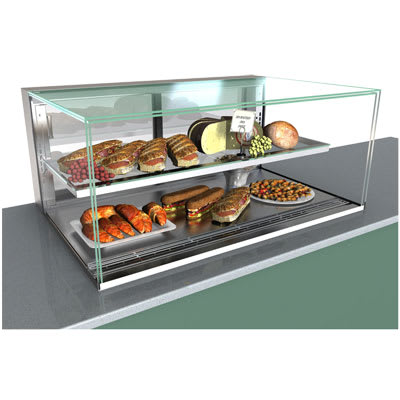 Reveal Service Refrigerated Slide In Counter Case, 35-3/4″W, 20-3/8″H (above counter) 39-5/8″H (overall), Breeze-E (Type II) with EnergyWise self-contained refrigeration, (1) removable & adjustable clear glass shelving, LED top & shelf lights, vertical, fixed front & side uv frameless glass, slide in base, glass ends, clear glass rear sliding doors, blue fin coated coil, condensate pan, black exterior & interior, cETLus, ETL-Sanitation