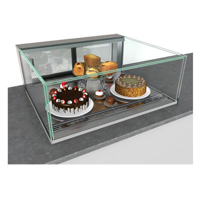 Reveal Service Refrigerated Slide In Counter Case, 47-3/4″W, 13-5/8″H (above counter), 32-7/8″H (overall), Breeze-E (Type II) with EnergyWise self-contained refrigeration, LED top light vertical, fixed front & side uv frameless glass, slide in base, glass ends, clear glass rear sliding doors, blue fin coated coil, condensate pan, black exterior & interior, cETLus, ETL-Sanitation