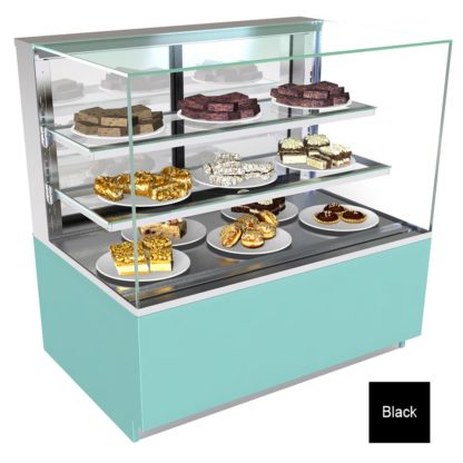Reveal Service Non-Refrigerated Display Case, freestanding, 47-3/4″W x 33″D x 47-1/8″H, (2) removable & adjustable clear glass shelving, LED top & shelf lights, vertical, fixed front & side uv frameless glass, full end panels, clear glass rear sliding doors, ABS plastic tub, black exterior & interior, adjustable locking casters, cETLus, ETL-Sanitation